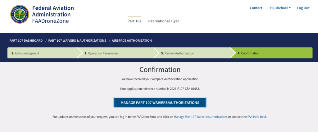 Once you submit your application, you’ll be given a reference number, and you’re able to check the status of your application at any time by logging back into your Part 107 Dashboard and selecting the Manage Part 107 Waivers / Authorizations button.