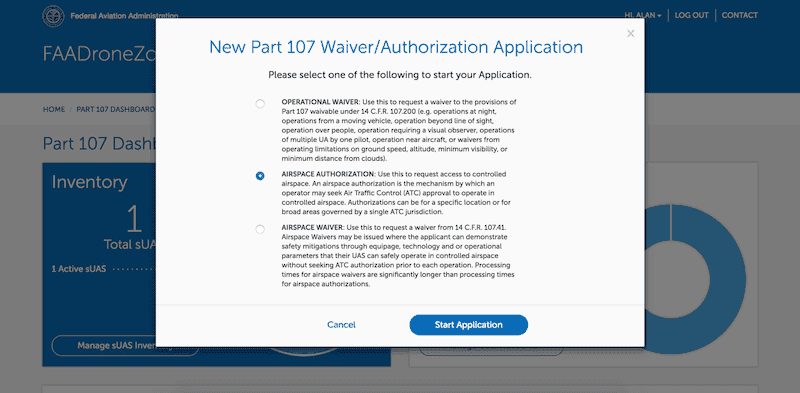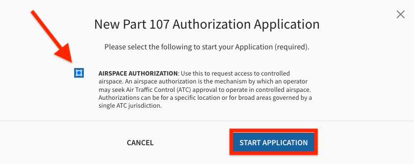 Click the button to the left of Airspace Authorization and click on ‘Start Application’.